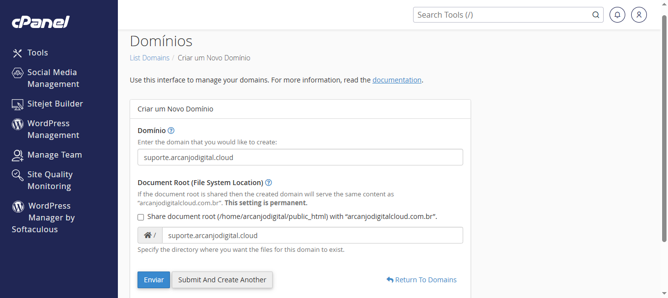 Para finalizar apenas clique em Enviar. E será criado um subdomínio na Raiz do seu Gerenciador de Arquivos, tipo /suporte.arcanjodigital.cloud