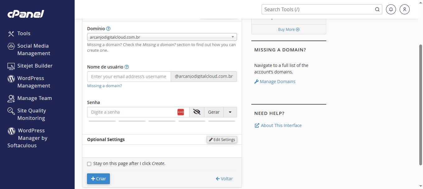 D) Optional Settings (Configurações opcionais) - defina o espaço de armazenamento da conta e outras preferências, para isso, clique em Edit Settings